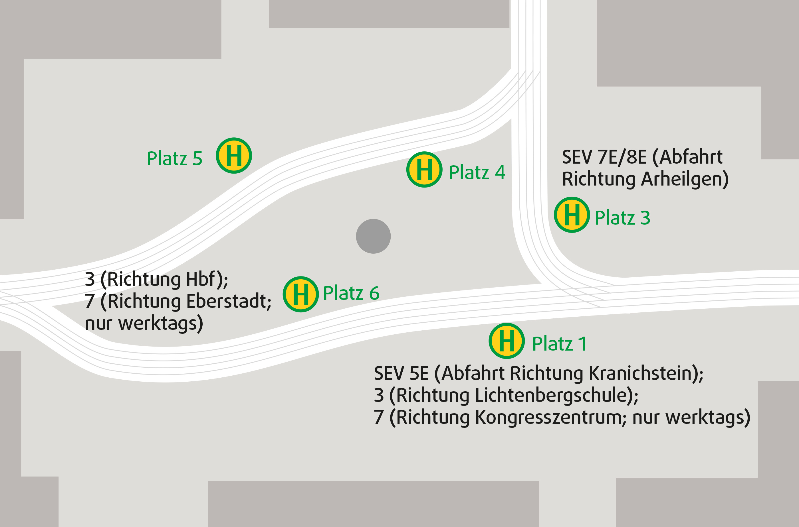 - Abfahrt der Ersatzbusse am Luisenplatz an Platz 3 vor dem Merck-Haus