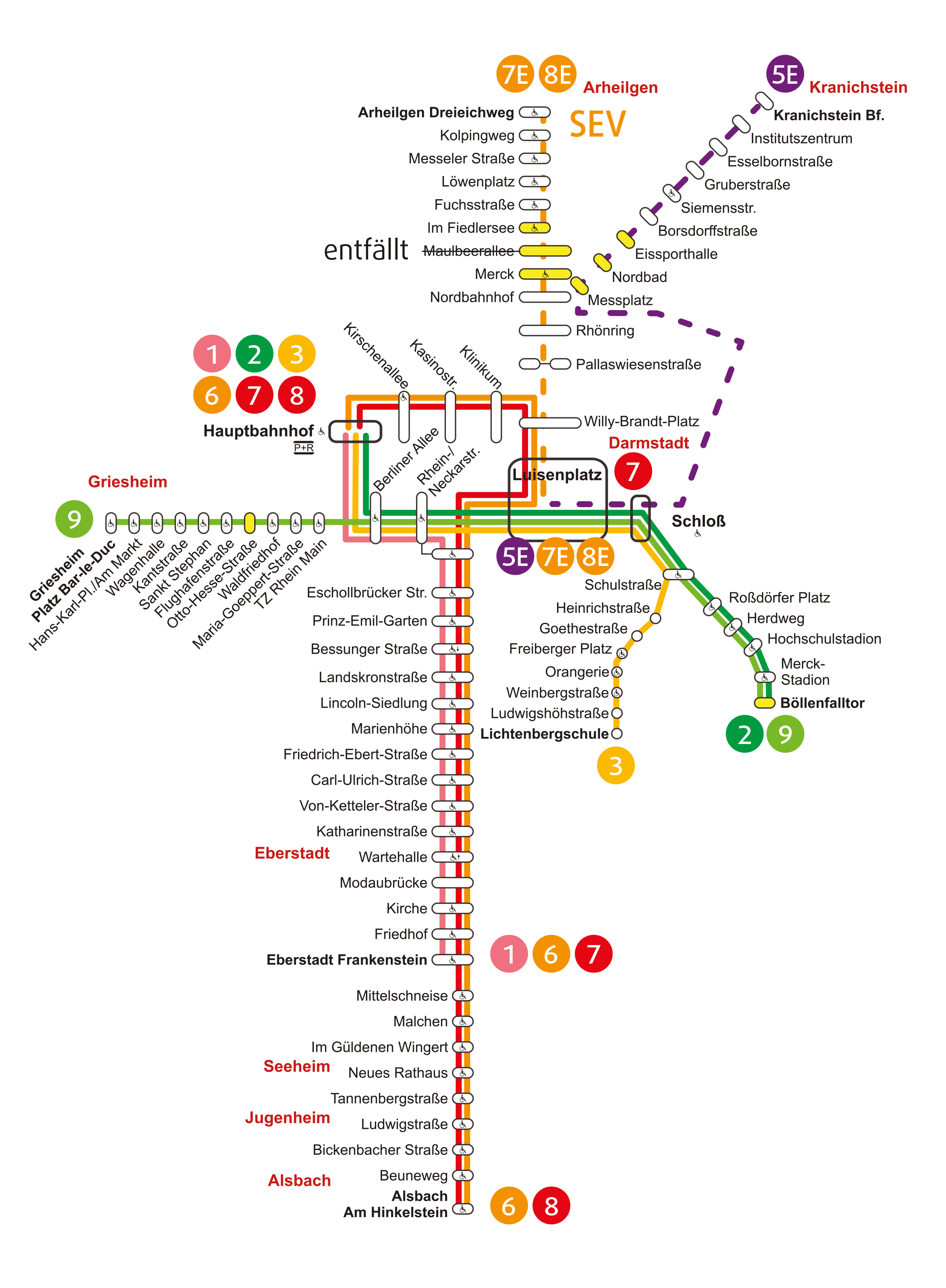 Zwischen Luisenplatz und Arheilgen verkehren Ersatzbusse als Linien 7E und 8E. Durch den Schienenersatzverkehr ergeben sich folgende Haltestellenänderungen: