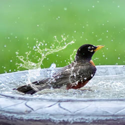 Von einer Tränke im Garten profitieren nicht nur Vögel und Insekten, sondern auch Igel und andere Tiere, die nicht einfach zur nächsten Wasserstelle fliegen können. Wenn eine größere Tränke oder ein Gartenteich vorhanden ist, ist es sehr wichtig eine Ausstiegshilfe anzubieten, damit Tiere, die hineinfallen, nicht ertrinken. Ideal ist dafür eine flache Uferzone im Gartenteich. In größeren Schalen kann ein raues Brett als Rettungsleiter fungieren. Zum Schutz vor Katzen sollte die Tränke nicht in der Nähe von Büschen, in denen sich die pelzigen Räuber gerne auf die Lauer legen, aufgestellt werden. Gerade Vögel nutzen die Wasserstellen und übrigens auch Sand zum ausgiebigen Bad und können dann leicht zum Opfer werden.