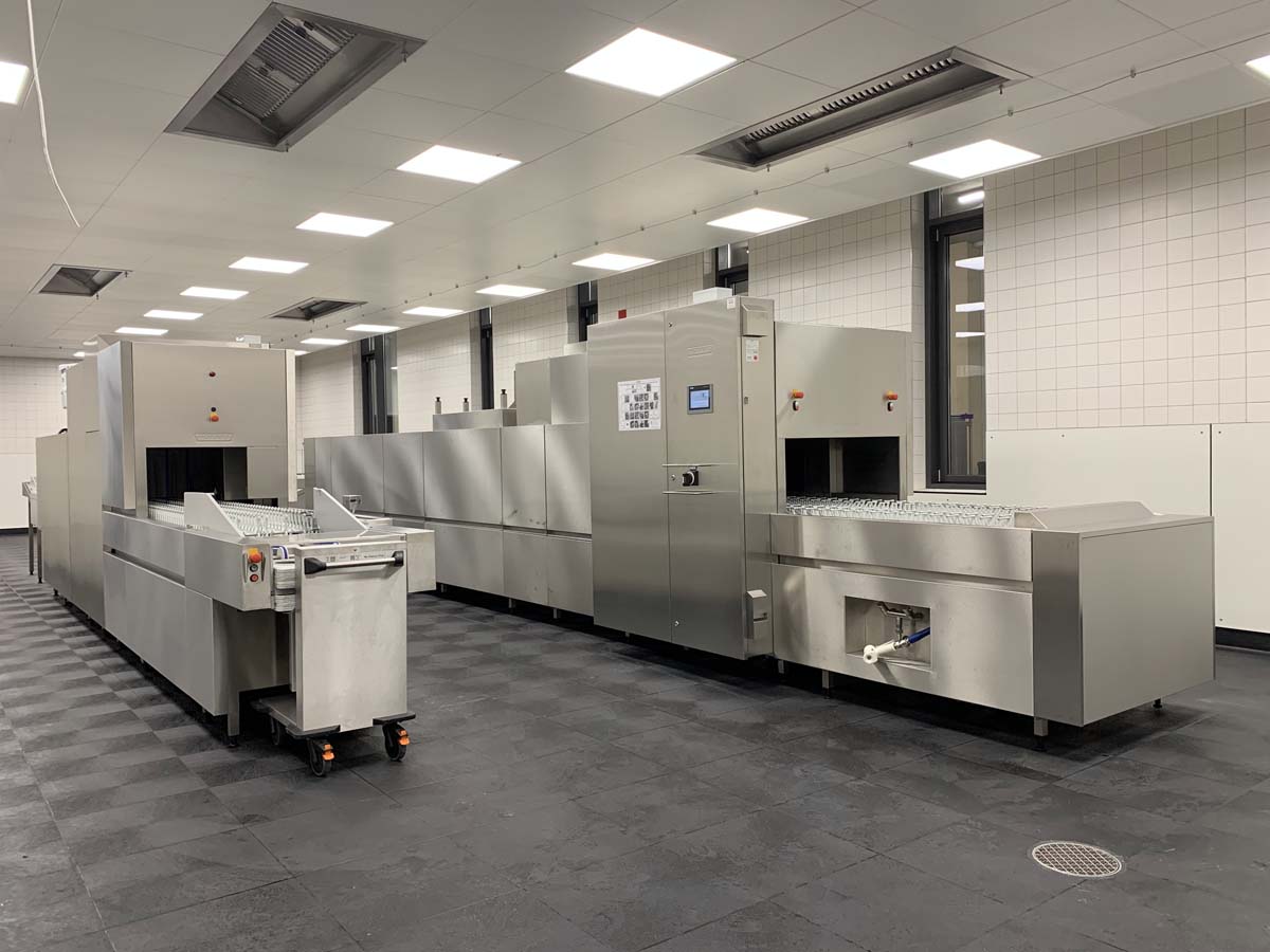 In der Küche der KCS werden jeden Tag durchschnittlich knapp 2500 Mahlzeiten hergestellt und es laufen etwa 40 000 Geschirr- und Besteckteile über die Spülbänder. Da die alten Spülmaschinen bereits seit 2003 in Betrieb waren und ein reibungsloser Einsatz nicht mehr gewährleistet war, wurde es Zeit für eine neue Maschine. Im Zuge des Austauschs wurde auch die bauliche Substanz und die Infrastruktur in dem Gebäude angepasst und erneuert.