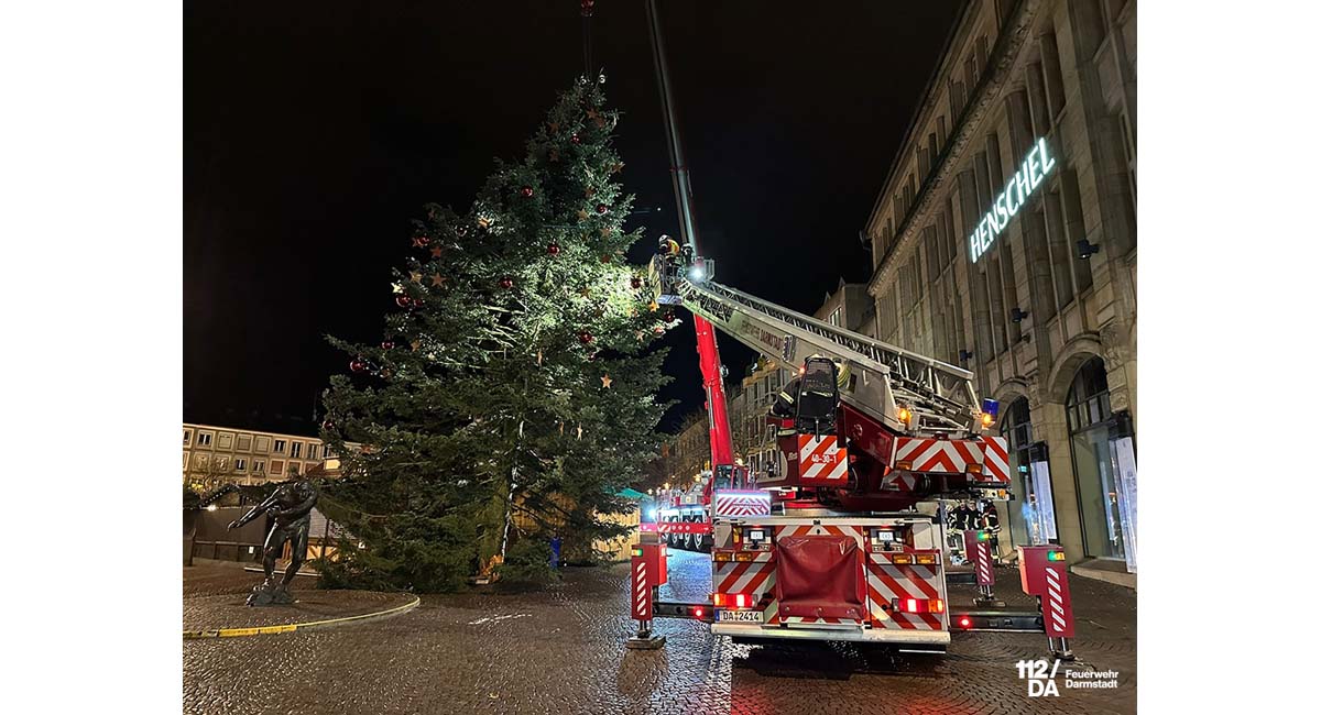 Am Freitag (23.12.22), 18:45 Uhr, wurde die Feuerwehr Darmstadt durch den Marktmeister des Marktplatzes informiert, dass sich der Weihnachtsbaum nach einer Windböe geneigt habe. Bei der Erkundung des Einsatzleiters vor Ort konnte keine akute Gefährdung festgestellt werden. Da in der Nacht und im Verlauf des nächsten Tages weitere Windböen nicht auszuschließen waren, musste der Baum nach Besucherschluss des Weihnachtsmarktes zusätzlich gesichert werden.