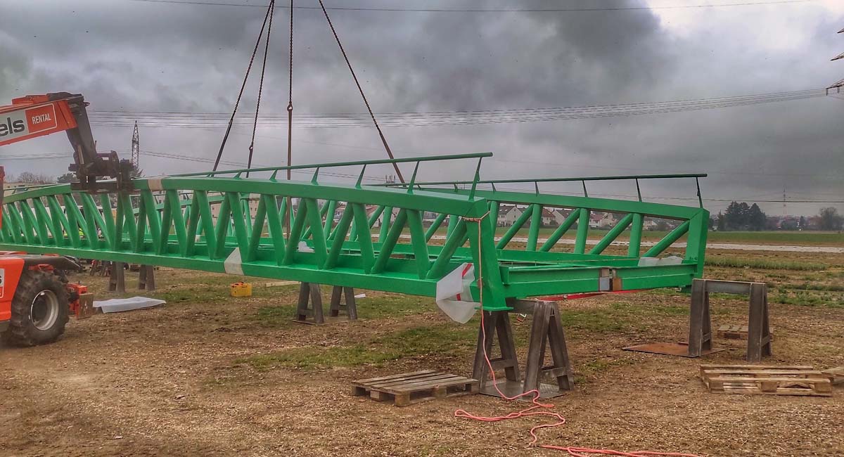 Die Stahlkonstruktion der Brücke wurde innerhalb von sechs Monaten in Norddeutschland in zwei Teilen hergestellt und mit einem Schwertransport nach Darmstadt-Wixhausen gebracht. Dort wurde die Brücke dann zusammengeschweißt.
