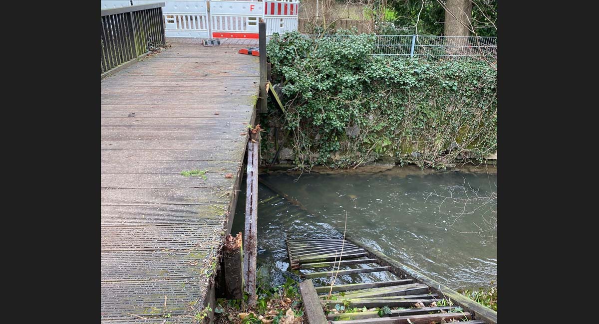 Erst Ende Februar 2023 fand eine Bauwerksprüfung an dieser Holzbrücke statt, die aus dem Jahr 1983 stammt. Zum damaligen Zeitpunkt waren die Geländerpfosten und Füllstäbe vorhanden und ohne Befund.
