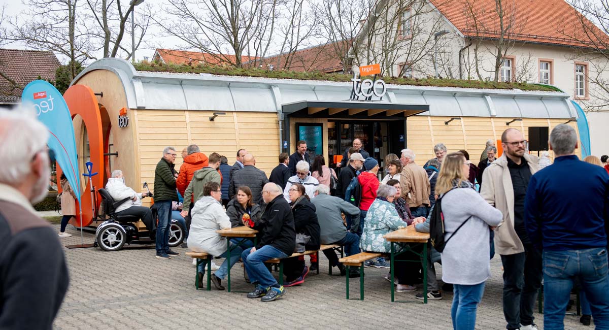 Bürgermeister Sebastian Bubenzer ist froh darüber, dass es gelungen ist, den teo nach Alsbach-Hähnlein zu holen. Er hatte auch die Idee zum Willkommens-Fest: „Mit dem teo haben wir ein passendes Konzept gefunden, die Nahversorgerlücke vor Ort schließen zu können. Der Einkauf für die Anwohnerinnen und Anwohner ist ab sofort wieder fußläufig möglich, was eine deutliche Steigerung der Lebensqualität bedeutet. Außerdem ist der teo durch seine markante Holzfassade und sein begrüntes Dach schön anzusehen. So einen neuen Nachbarn begrüßt man natürlich gerne in einem feierlichen Rahmen.“