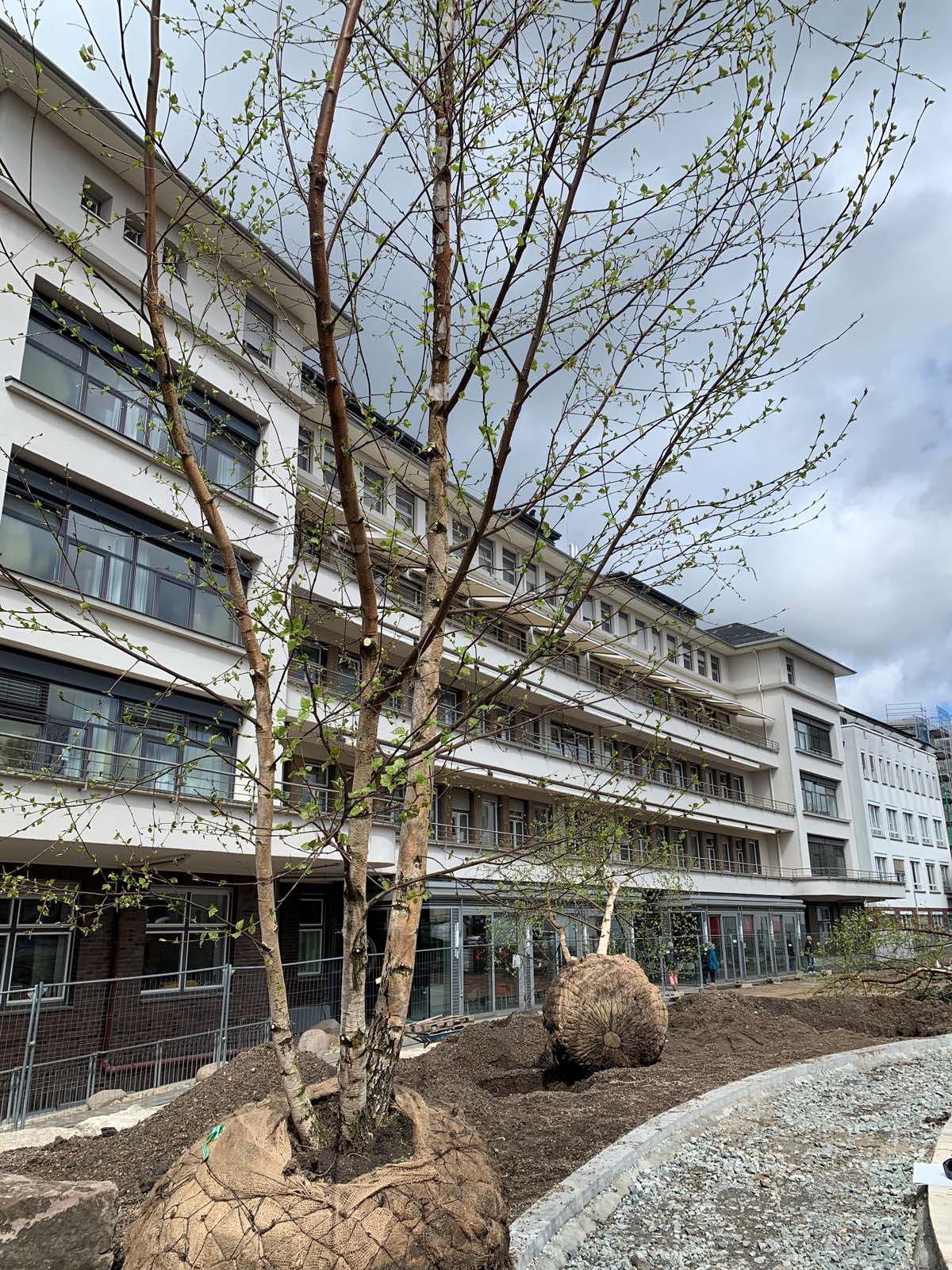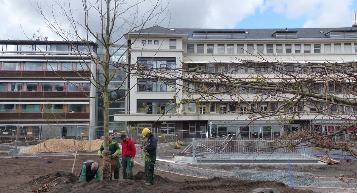 30 Bäume pflanzen die Mitarbeiter der Gartenbaufirma Säger. Darunter Platanen, Birken Ahorn und andere. Manche sind über sechs Meter hoch. Baumart und Standort der Bäume wurde zwischen den zuständigen Ämtern der Stadt Darmstadt, den Architekten der Tiefgarage und dem Bauherren abgestimmt. Dabei wurden auf die Höhe der Aufschüttung und die aktuellen Klimaveränderungen geachtet. Darunter auch Purpur-Erlen (Alnus spaethii) die auch den Klimaveränderungen besonders standhalten wird.