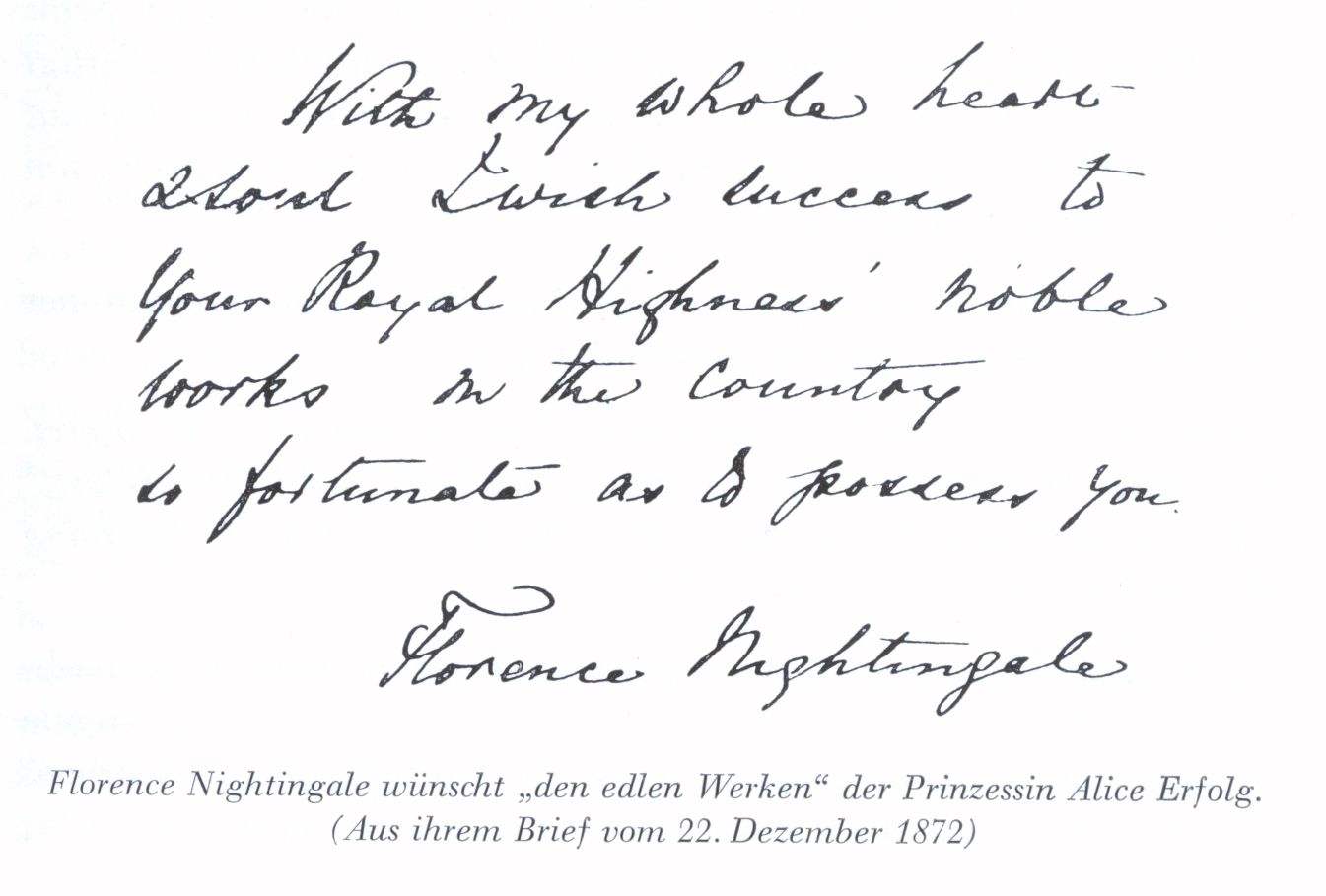 In den Archiven der Alice-Schwesternschaft vom Roten Kreuz befindet sich ein Schreiben Florence Nightingales an Prinzessin Alice anlässlich der Gründung des Alice-Frauenvereins. Darin lobt sie die Arbeit der Prinzessin: