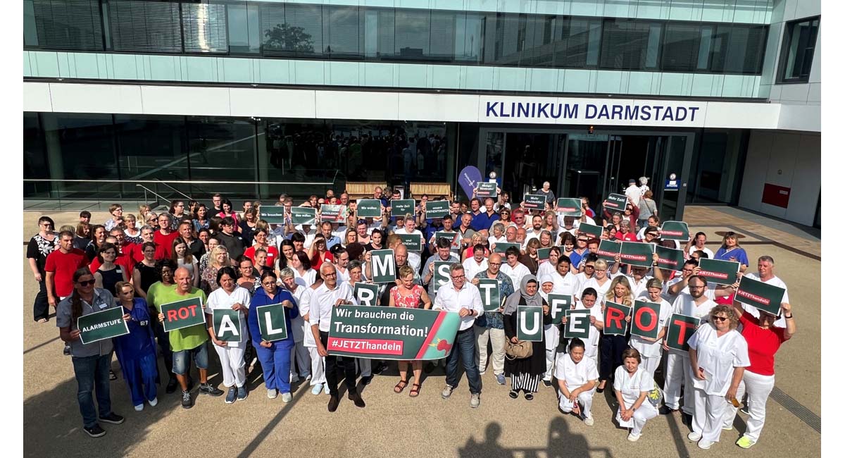 Seit einem Jahr kämpfen die Krankenhäuser in Deutschland mit der „Aktion Alarmstufe Rot – Krankenhäuser in Not!“ für eine faire und nachhaltige Finanzierung. Die zweite Aktion unter dem Hashtag #jetzthandeln am 20. Juni 2023 ruft auch die Mitarbeitenden aller Berufsgruppen des Klinikums Darmstadt auf den Plan. Gemeinsam mit der Geschäftsführung fordern sie, die Transformation anzugehen, die Reform umzusetzen und den Krankenhäuser jetzt finanziell unter die Arme zu greifen – und dies nicht den Eigentümerinnen zu überlassen.
