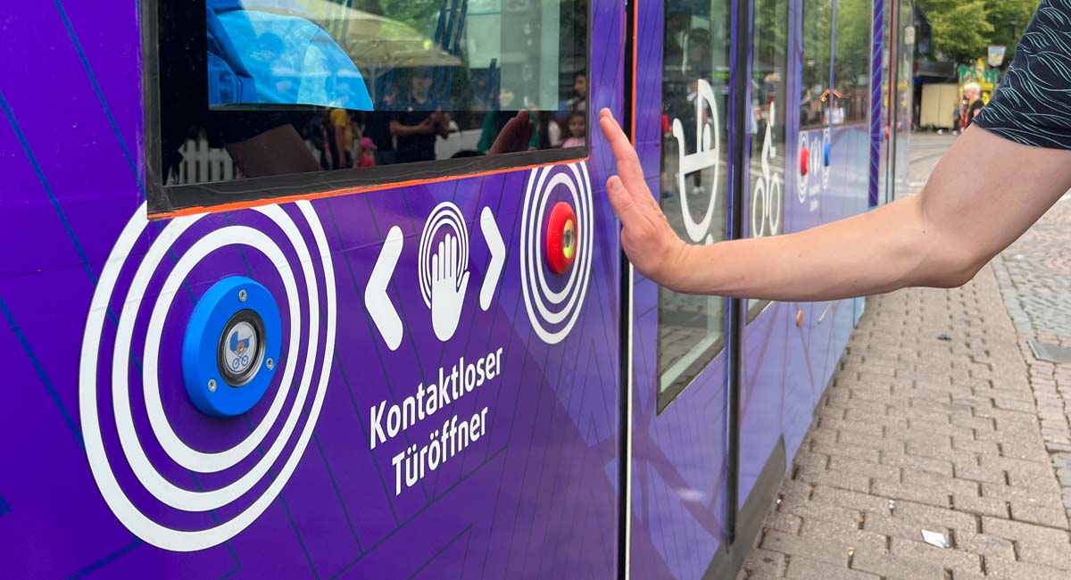 Die Türöffner sehen aus wie bisher – hinter ihnen ist jedoch ein Sensor verbaut, sodass sich die Tür automatisch öffnet, sobald Fahrgäste die Hand wenige Zentimeter vor den Türöffner halten. Damit die Fahrgäste den Unterschied zu den herkömmlichen Türöffnern direkt erkennen, ist die Bahn mit einem entsprechenden Piktogramm versehen.