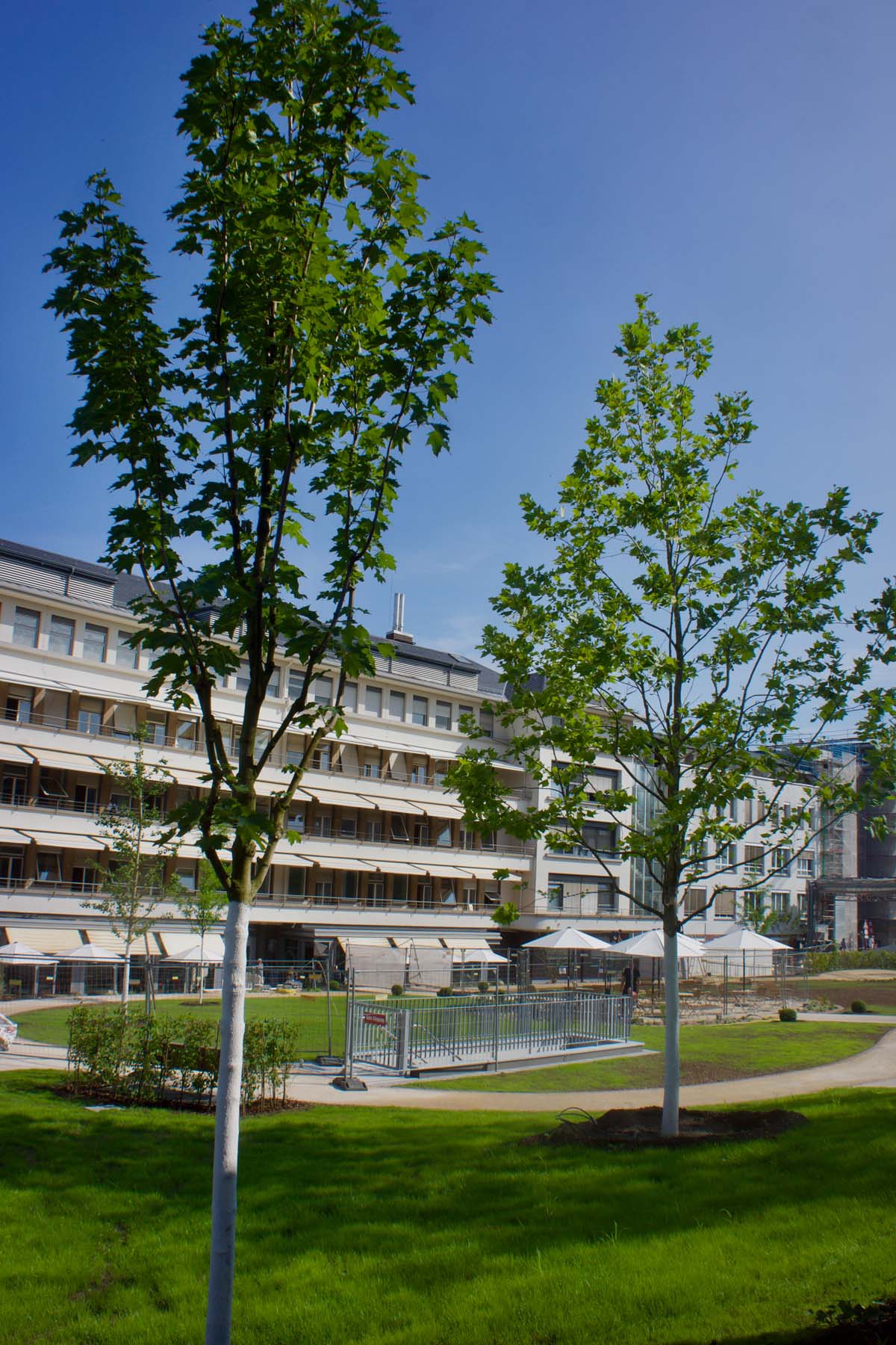 Die noch dünnen Äste und zarten Blätter des Blauglockenbaums schwingen im schwachen Wind, kleine Insekten summen leise zwischen Hainbuche und Feldahorn und der grüne Rasen glänzt im grellen Licht der Sonnenstrahlen. Wo vor einem halben Jahr noch Großbaustelle und Betonwüste war lädt nun eine große Parkanlage zum Verweilen ein.
