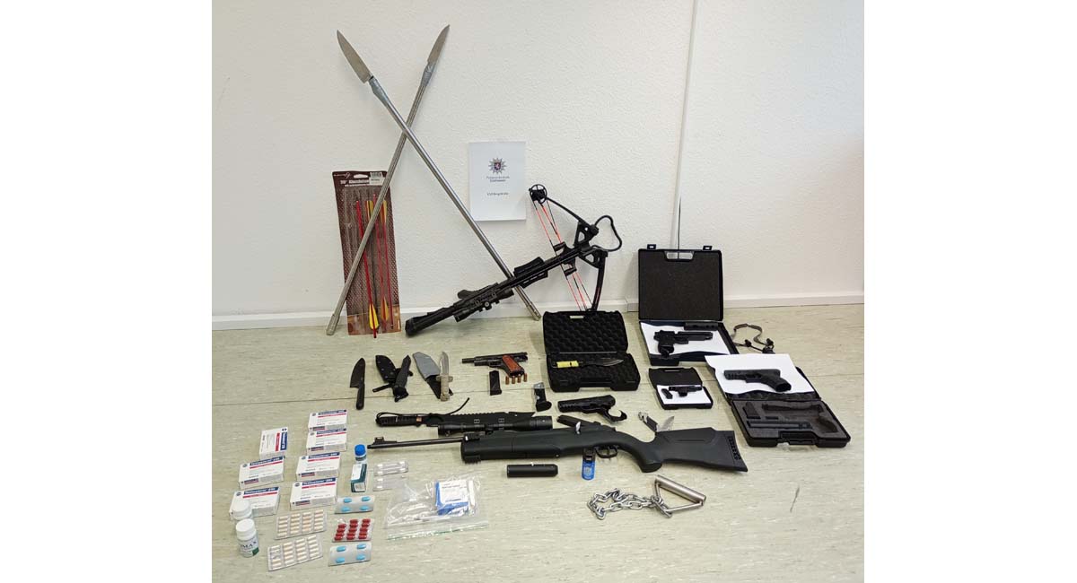 Die Polizisten fanden hierbei Waffen sowie Substanzen, die nach derzeitigem Ermittlungsstand unter das Doping- bzw. Arneimittelgesetz fallen. Unter den sichergestellten Waffen befand sich unter anderem eine Armbrust mit mehreren Pfeilen, ein täuschend echt aussehendes Luftdruckgewehr mit Schalldämpfer und Zielfernrohr und eine ebensolche Kurzwaffe.