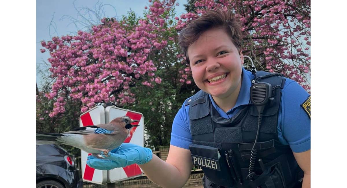 Einer aufmerksamen Streife des zweiten Polizeireviers fiel am Sonntag (07.04.24) in Darmstadtein farbenfroher Eichelhäher, mitten auf der Klappacher Straße auf. Das Tier wirkte äußerlich unverletzt, aber benommen, weshalb es sich offenbar selbstständig nicht mehr fortbewegen konnte. Daraufhin holte die Polizeibeamtin den Vogel sachte von der Straße und brachte diesen zum nahegelegenen Polizeirevier. Dort angekommen wurde dem gefiederten Freund Wasser gereicht und der Innenhof des Präsidiums gezeigt, wo sich der sogenannte „Waldpolizist“ regenerieren konnte. Nur kurze Zeit später schwang er sich wieder auf einen Baum. Nachdem er dort kurz rastete und sich orientiert hatte, flog der Vogel in Richtung des angrenzenden Waldes davon.