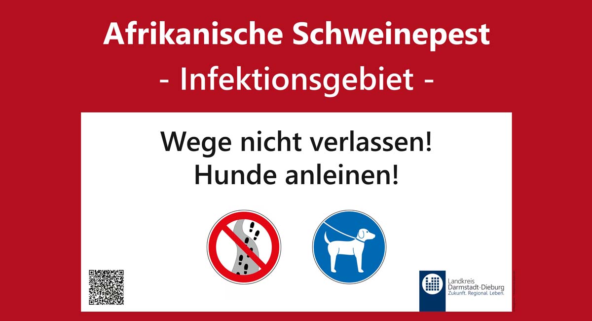 Der Landkreis Darmstadt-Dieburg stellt in enger Zusammenarbeit mit den von der Afrikanischen Schweinepest (ASP) betroffenen Kommunen spezielle Hinweistafeln in Waldnähe auf, welche durch verständliche Symbole über die Gefahren und erforderlichen Schutzmaßnahmen informieren.