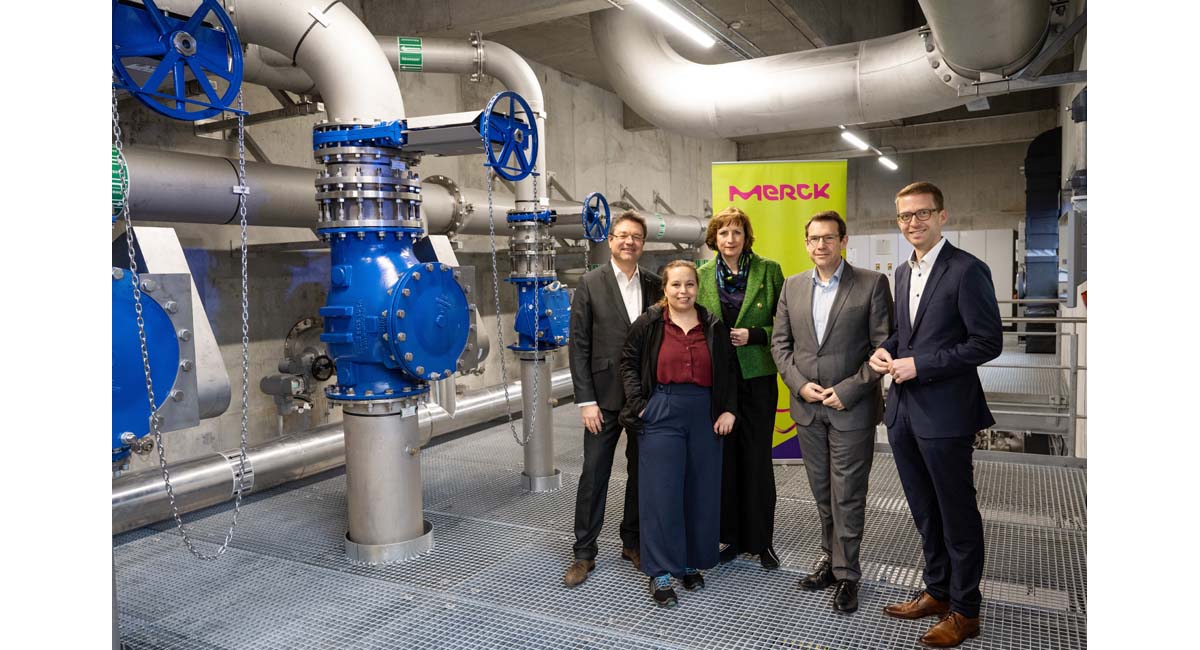 Von links nach rechts: Merck-Standortleiter Matthias Bürk, Luka Gebhard, verantwortlich für den operativen Betrieb der Kläranlage bei Merck in Darmstadt, Regierungspräsidentin Brigitte Lindscheid, Darmstadts Oberbürgermeister Hanno Benz und Michael Ruhl, Staatssekretär im zuständigen Hessischen Ministerium für Landwirtschaft und Umwelt, Forsten, Jagd und Heimat.
